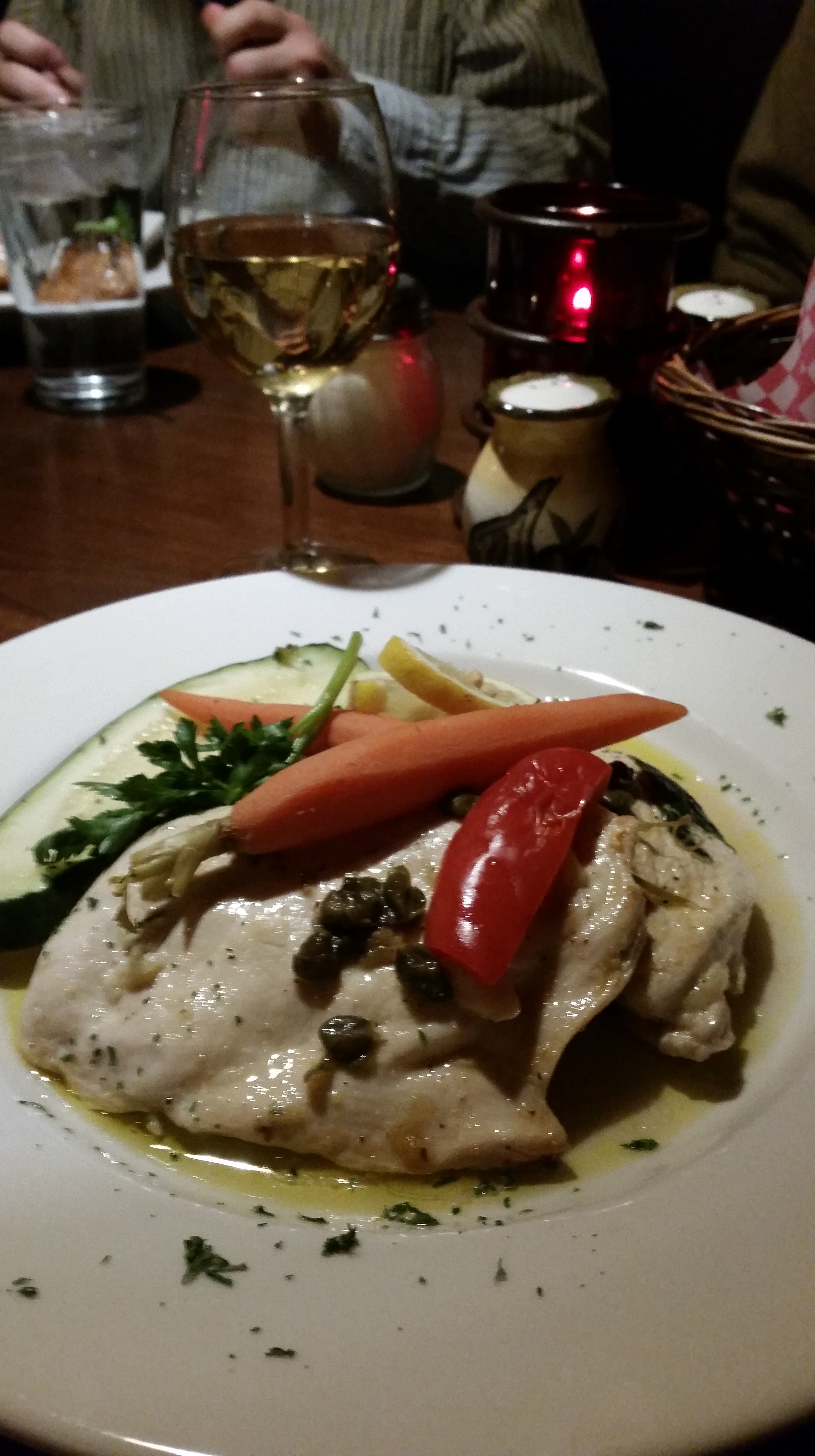 For me, Annie makes a special plate. All I had to do was tell Aaron, our terrific server, “Tell Annie to make the ‘Marti special'”. Basically, it’s Chicken Picatta, modified for my diet. Here’s Annie’s description of the “regular” Chicken Picatta.