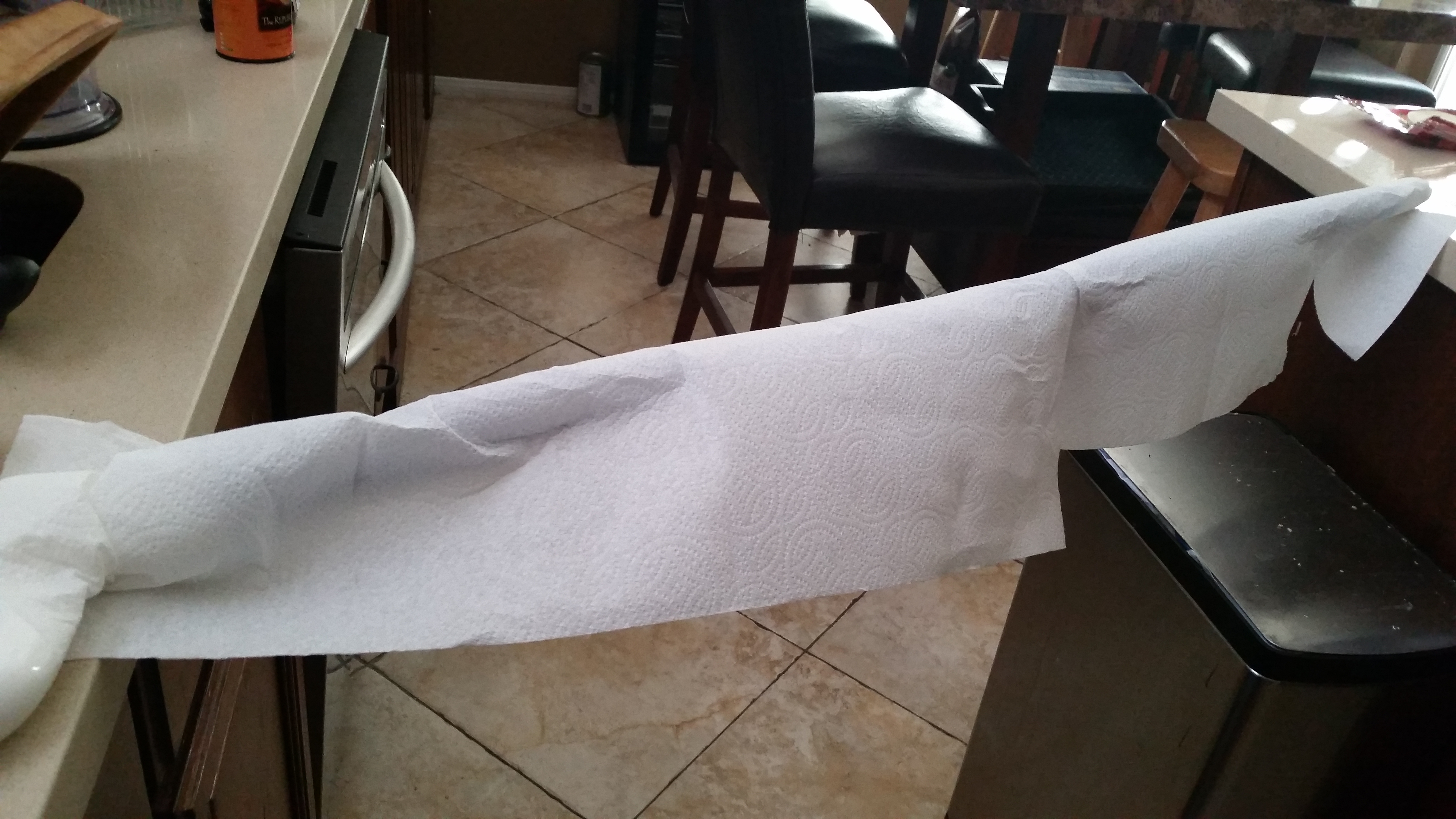 While the shells are baking. find a long, round utensil that you can drape the cheese rounds over to let them harden into typical taco shell shapes.  A broom handle is PERFECT for this.  Drape paper towels over the broom handle – this will absorb the grease from the cheese and not allow the grease to drip on the floor.  Here’s what my rig looks like: